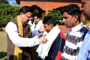 मुख्यमंत्री पुष्कर सिंह धामी ने गुरूवार को मुख्यमंत्री आवास में उत्तरकाशी के सिलक्यारा रेस्क्यू ऑपरेशन में टनल की खुदाई में अहम भूमिका निभाने वाले 12 रैट माइनर्स को शॉल ओढ़ाकर सम्मानित किया और सभी रैट माइनर्स को 50-50 हजार रूपये के सम्मान राशि के चेक भी प्रदान किये।