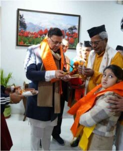 अयोध्या में राम मंदिर प्राण प्रतिष्ठा समारोह से पूर्व शुक्रवार को मुख्यमंत्री आवास में अक्षत वितरण टोली के सदस्यों द्वारा श्री राम मंदिर, अयोध्या से लाए गए पूजित अक्षत, श्री राम मंदिर का चित्र एवं निमंत्रण पत्रक मुख्यमंत्री पुष्कर सिंह धामी को भेंट किये गये।